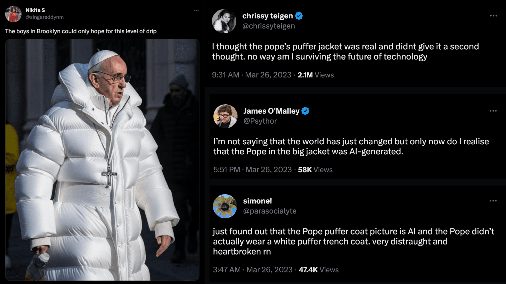 - Evaluate the context in which the video was posted or shared, as it may indicate if it is genuine or not (e.g., why would the pope suddenly deviate from the typical regalia often worn in the papal household?)