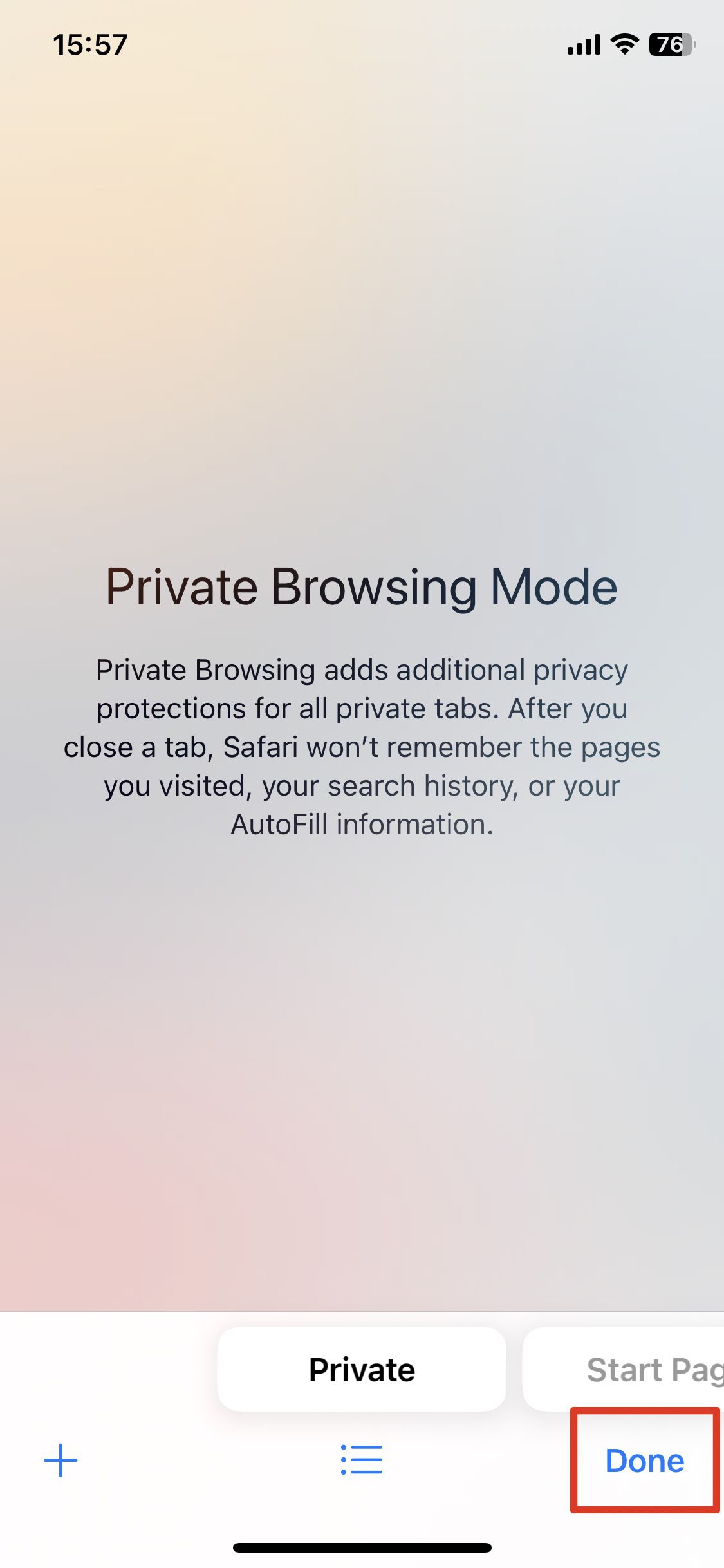- Tap the + button to open a new Private Browsing tab, or click Done to return to an existing one.