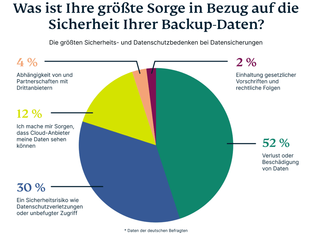 Unsere Studie zeigt, dass 77 Prozent der deutschen Teilnehmer sich Sorgen hinsichtlich der Sicherheit und des Datenschutzes ihrer gesicherten Daten machen. Diese Befürchtungen sind sehr unterschiedlich und reichen von zehn Prozent der Teilnehmer mit deutlichen Bedenken über 29 Prozent mit mittleren und 40 Prozent mit leichten Bedenken. Nur 15 Prozent der Befragten haben sich über die Risiken keine Gedanken gemacht, und sechs Prozent machen sich keine Sorgen um die Sicherheit der von ihnen gesicherten Daten.