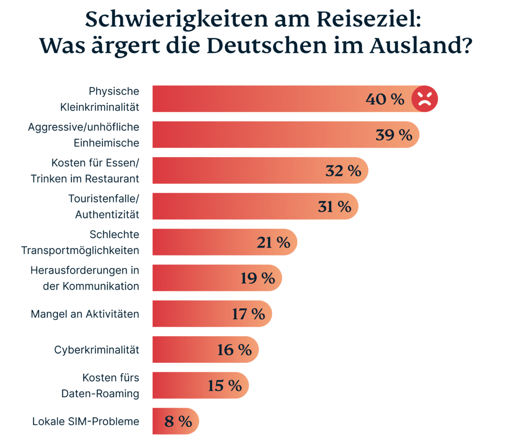 Trotz der aufregenden Aussicht, neue Reiseziele zu erkunden, erwarten die Urlauber weitere Ärgernisse. Laut unseren Befragten gehören zu den größten Sorgen über das Urlaubsziel selbst die physische Sicherheit vor Ort: 40 Prozent der Reisenden fürchten sich vor Taschendieben und asozialem Verhalten. Knapp dahinter folgen Frustrationen hinsichtlich der Gastfreundlichkeit vor Ort, von denen 39 Prozent das Verhalten der Einheimischen gegenüber Touristen als wenig einladend empfinden. Die Kosten für einen Restaurantbesuch stören 32 Prozent, was zeigt, dass die Preissensibilität über die bloße Buchung der Reise hinausgeht.