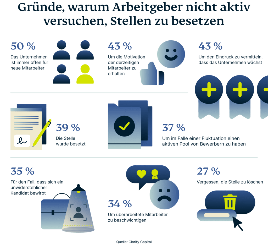 Im Rahmen der Studie wurden auch Personalverantwortliche befragt, die Stellen selbst dann ausgeschrieben ließen, wenn sie nicht aktiv auf der Suche nach neuen Mitarbeitern waren, und nach den Gründen für diese Vorgehensweise gefragt. Der häufigste Grund war, neue Mitarbeiter zu finden, obwohl sie nicht aktiv gebraucht werden. Einige Arbeitgeber nutzen sie jedoch, um dynamischer und wachsender zu erscheinen, sowohl für die derzeitigen Mitarbeiter als auch für externe Beobachter. Andere sehen sie als eine Möglichkeit zum Aufbau einer Datenbank mit Lebensläufen, einer Ressource, auf die sie zurückgreifen können, wenn ein wirklicher Bedarf entsteht.