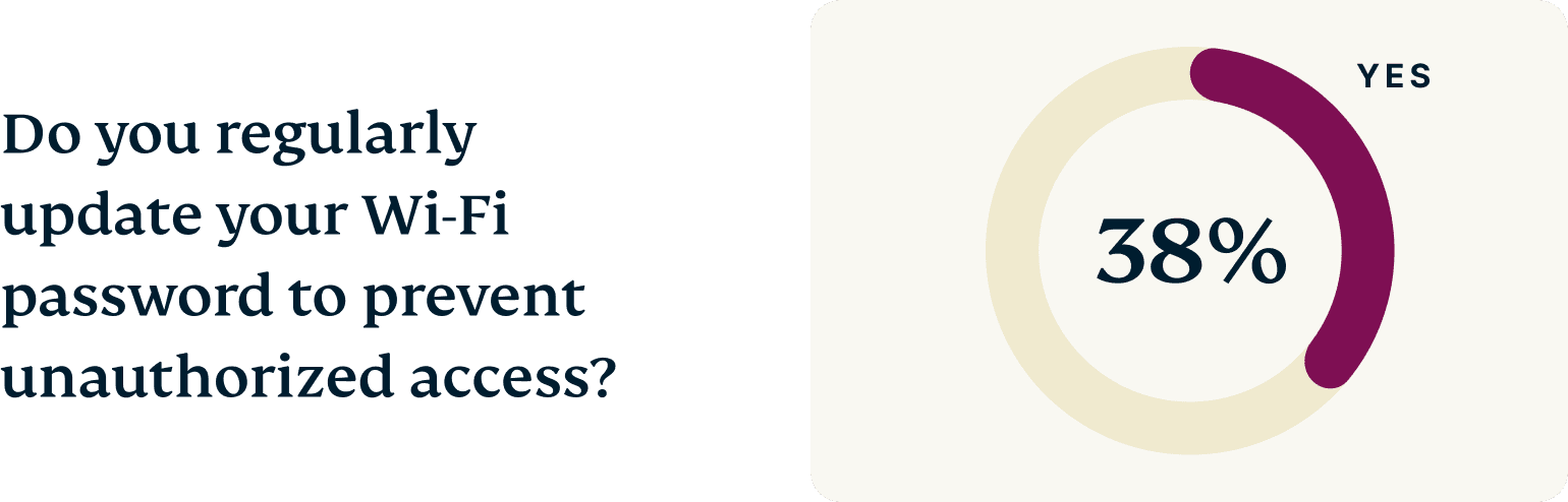 Our survey results reveal that a significant majority (94%) of respondents use passwords to protect their home Wi-Fi networks, which aligns with the common practice of setting up passwords during router installation. Furthermore, 31% of respondents admit to updating their passwords regularly. While this practice isn't necessary if you have a strong password saved in a password manager, it can prevent past Wi-Fi users from retaining access.