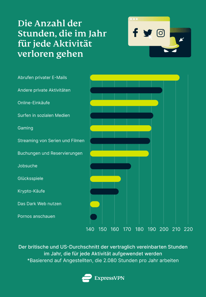 Vier von zehn Befragten gaben an, anstelle ihrer Arbeit auf ihren Firmengeräten Glücksspiele zu spielen, im Durchschnitt drei Stunden pro Woche, während 37 Prozent antworteten, ähnlich viel Zeit mit dem Kauf von Kryptowährungen und 33 Prozent mit Suchen im Dark Web zu verbringen.