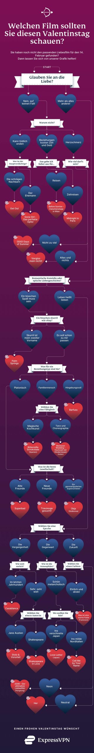 Unsere Streaming-Experten haben da etwas vorbereitet: Im folgenden Flowchart finden Sie einige der besten Liebesfilme aus aller Welt. Egal, ob Sie gerade ein romantisches Date vorbereiten oder Ihr Singledasein feiern wollen - folgen Sie einfach den Pfeilen und Sie finden garantiert einen lohnenden Film für diesen Valentinstag.