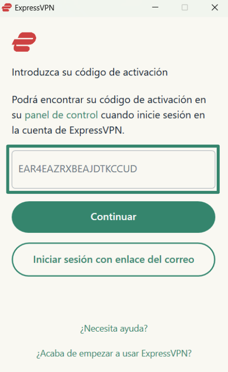 - Introduce tu código de activación para iniciar sesión en ExpressVPN. El código lo encontrarás en tu panel de control de ExpressVPN cuando inicies sesión en el portal web.