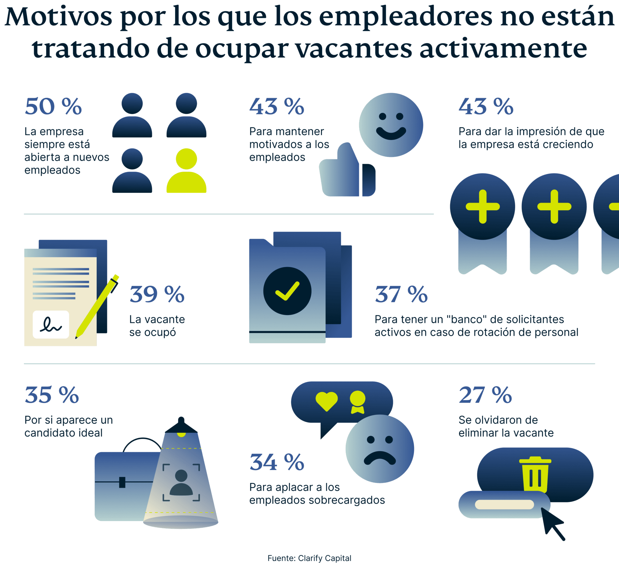 • Un estudio de Clarify Capital descubrió que, si bien muchos empleadores mantienen los empleos fantasma listados por si acaso se presenta un buen candidato, el 43% de los que publican empleos fantasma lo hacen para dar la impresión de que la empresa está creciendo.