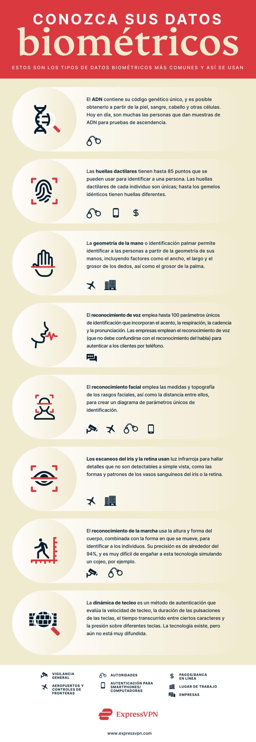 Vea este gráfico para tener una mejor idea de cuales son los usos más comunes de los datos biométricos:
