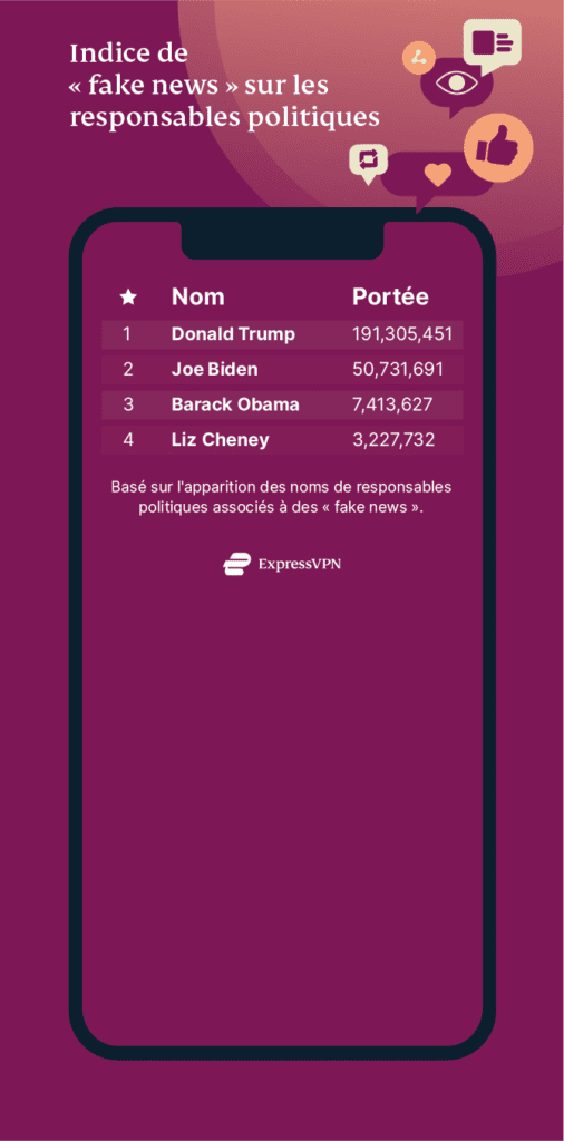 Vient ensuite l'actuel président américain Joe Biden, dont les messages associés aux « fake news » ont atteint 50 731 691 personnes en ligne.