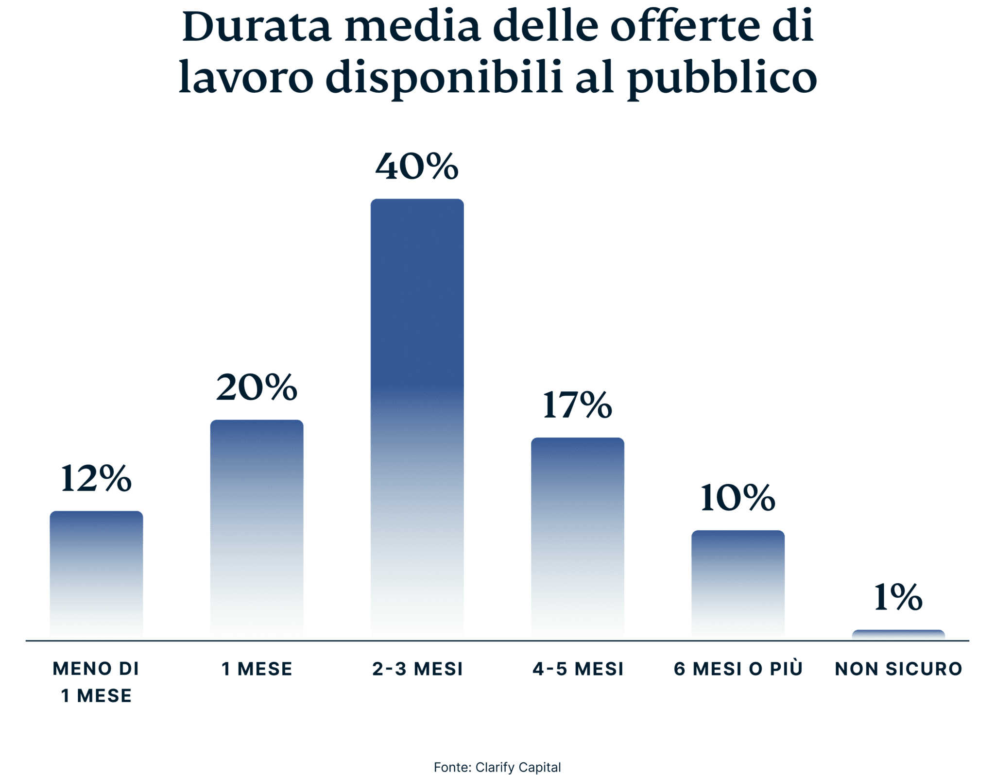 Uno studio di Clarify Capital, una società di consulenza finanziaria di New York, ha fatto luce su questo fenomeno. Intervistando oltre 1.000 responsabili delle assunzioni, è emerso che l'arco di tempo più comune in cui un lavoro viene inserito è di due o tre mesi, con un 10% che arriva a sei mesi o più.