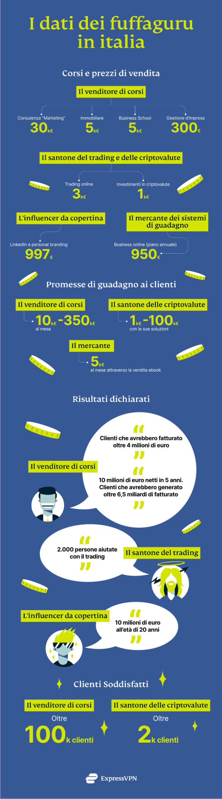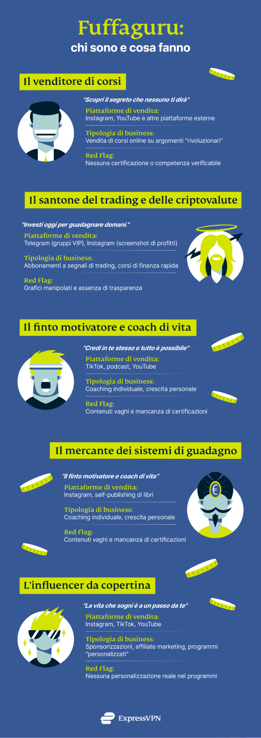 Questo genere di fuffaguru crea e vende corsi online: sostiene di possedere delle conoscenze esclusive e rivoluzionarie sui settori più disparati, che sicuramente ti porteranno potere e cospicui guadagni. Nel concreto, però, non ha neppure una laurea o delle competenze certificabili. Alla fine, i corsi si dimostrano una mera rielaborazione di contenuti già disponibili gratuitamente online.