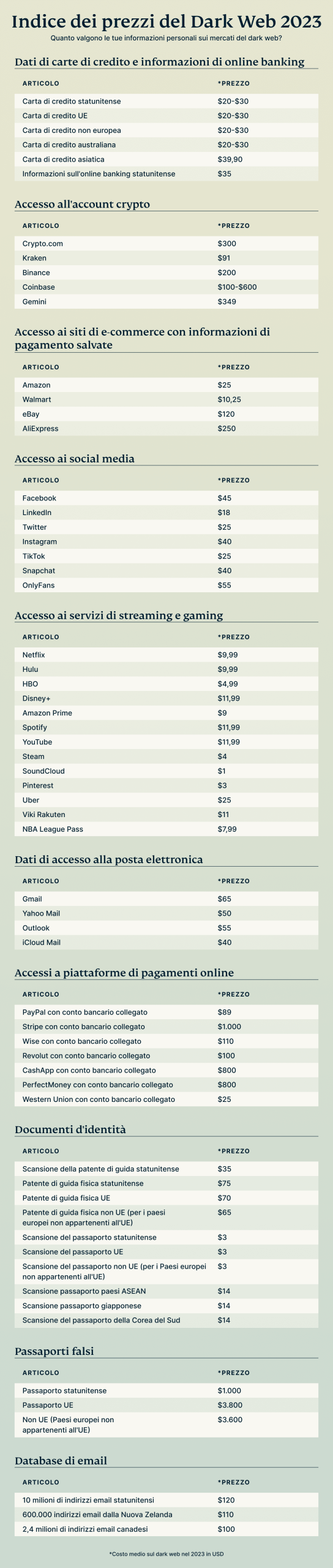 Quando si parla di dark web, le informazioni personali possono essere comprate e vendute a prezzi variabili, a seconda del tipo e della quantità di dati venduti. Si va da pochi dollari per una singola credenziale di accesso a migliaia di dollari per un profilo completo che può arrivare a comprendere la scansione di un passaporto o di un documento fisicamente contraffatto. Questo mercato in continua crescita delle informazioni personali sul dark web è una delle ragioni principali per cui le persone devono adottare misure di protezione dei propri dati.