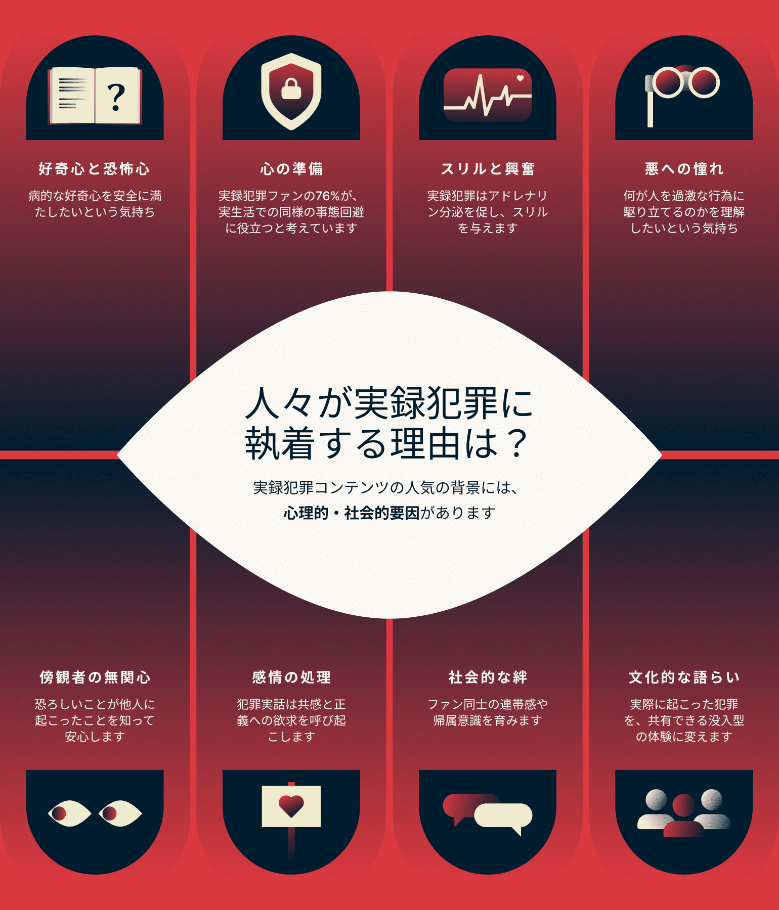 • 好奇心、恐怖への対処、スリルの追求といった心理的要因が、人々の犯罪の実話に対する執着心を駆り立てる