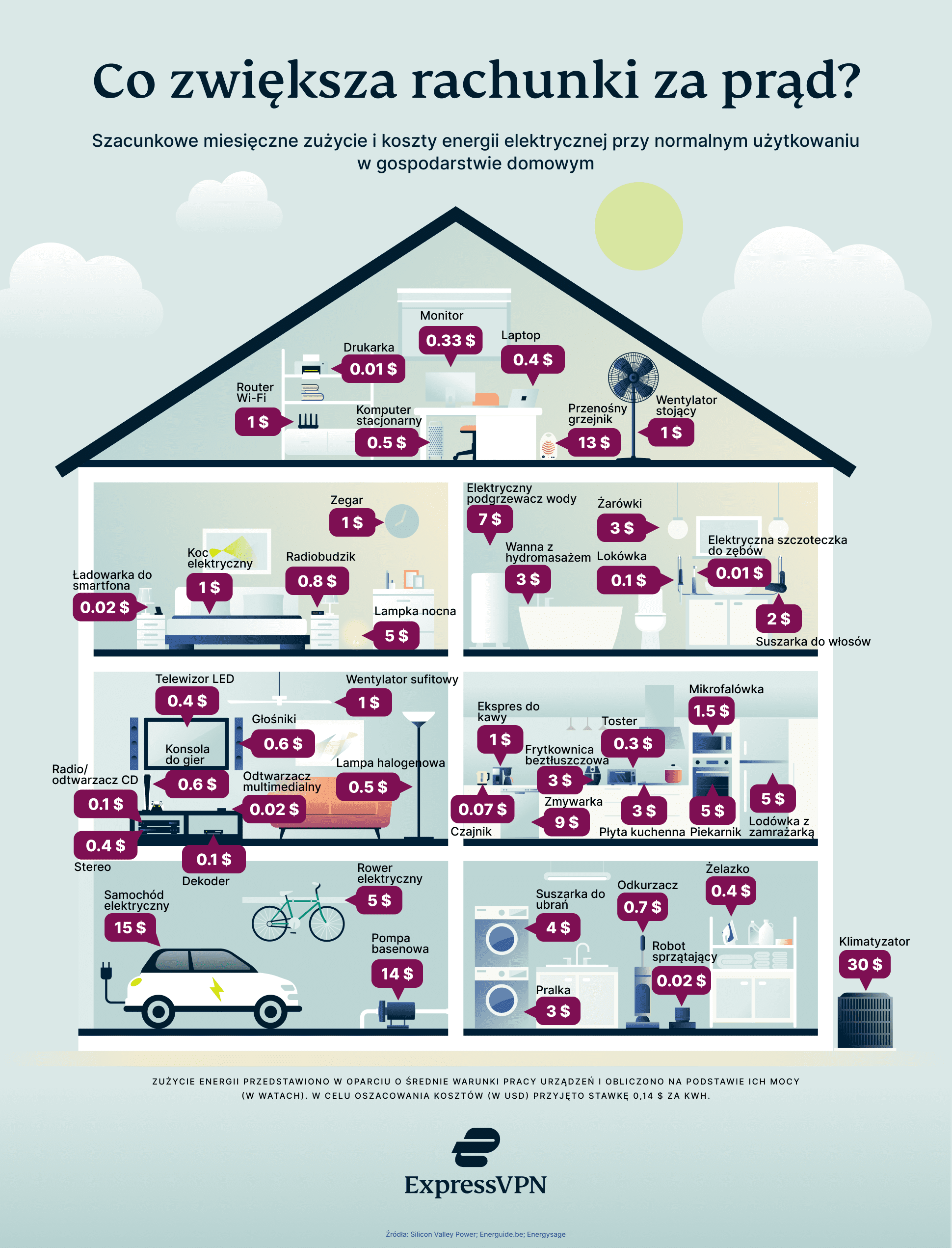 Poniższa infografika przedstawia miesięczne zużycie energii przez poszczególne urządzenia w typowym amerykańskim gospodarstwie domowym wraz z kosztami: