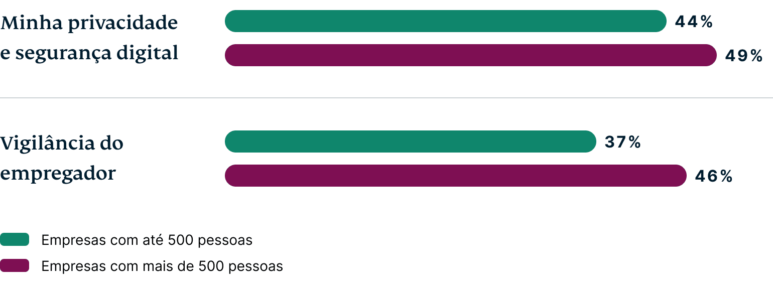 - Principais preocupações com a vigilância: As principais preocupações dos funcionários relacionadas à vigilância no local de trabalho são o rastreamento de sua localização em tempo real (51%) e o monitoramento de tela em tempo real (50%). (Ir para esta seção.)