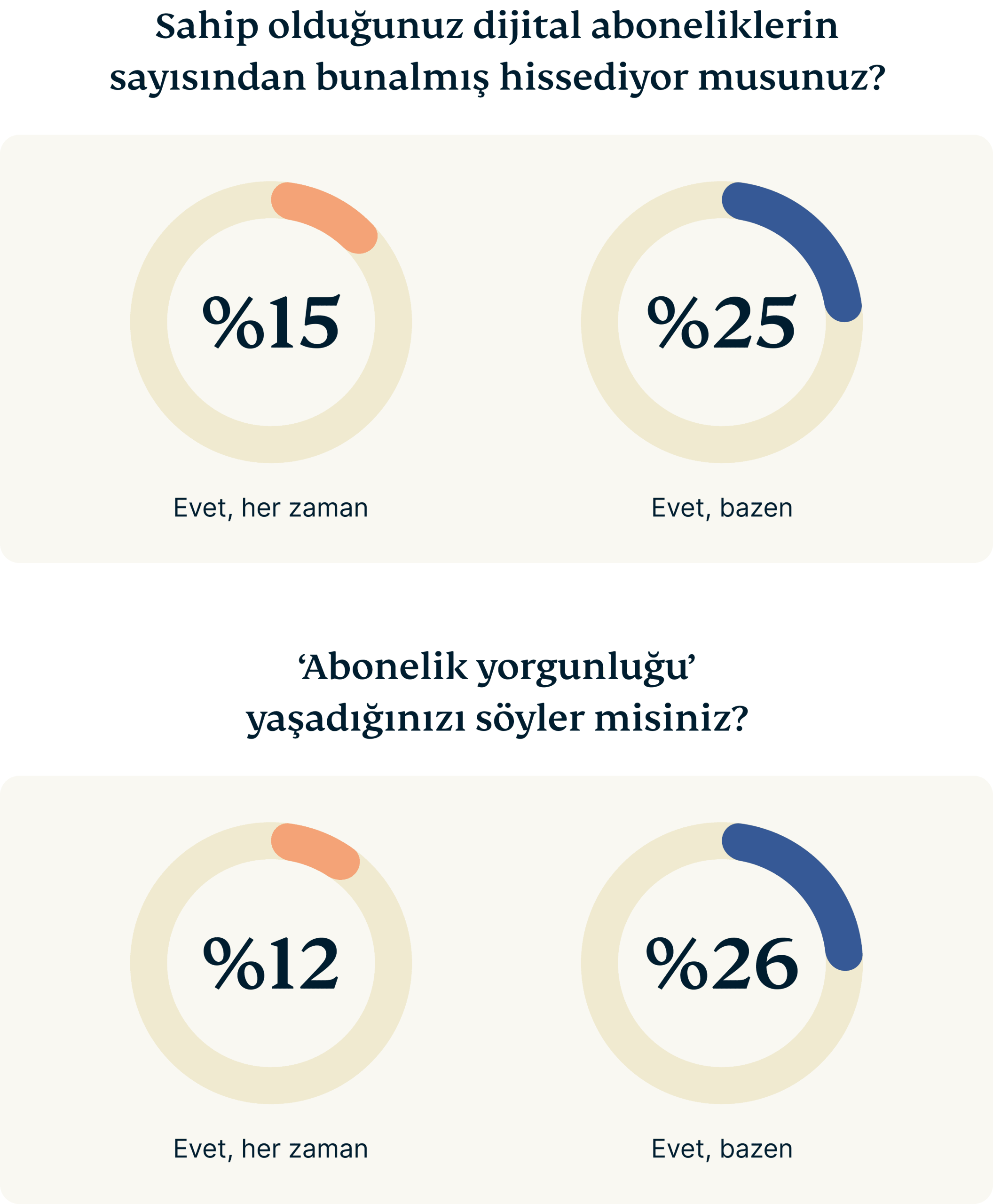 Katılımcıların %15’i için bu bunalmışlık hissi sürekli bir durumken, %25'i ise zaman zaman bunu yaşadığını belirtiyor. Bu durumun nedenleri değişiklik gösterse de en çok suçlanan faktör maliyet. Katılımcıların %49’u dijital aboneliklerin yüksek maliyetlerinin önemli bir stres kaynağı olduğunu belirtiyor. Ancak sorun burada bitmiyor; %37'si tüm abonelikleri takip etmenin zor olduğunu söylerken, %35'i ise ödediği tüm hizmetleri kullanmaya yeterli zamanı olmadığını söylüyor.