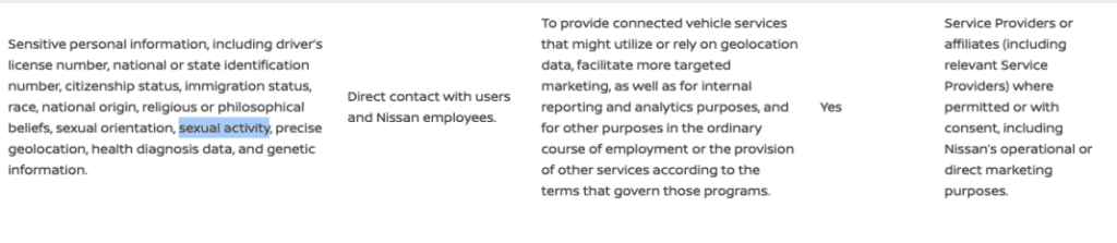 Tesla geht noch einen Schritt weiter und ermöglicht Ihnen zwar, ein Opt-out für die Erfassung von Daten zu erteilen, versieht dieses jedoch mit einer verschleierten Warnung davor, dass dies einen Einfluss auf die Funktionsweise Ihres Fahrzeugs haben könnte. Nissan geht sogar so weit, dass es Ihnen die Verantwortung auferlegt, andere über die Datenschutzrichtlinie Ihres Fahrzeugs zu informieren.