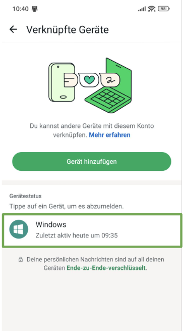Die Geräteverifizierung stellt sicher, dass nur deine verifizierten Geräte auf dein WhatsApp-Konto zugreifen können. WhatsApp speichert ein eindeutiges Sicherheits-Token auf deinem Gerät, das mit jeder Nachricht aktualisiert wird (der Prozess wird Bootstraping der Sicherheitstoken genannt). Dieser Mechanismus stellt sicher, dass eine Kopie des Tokens nicht an anderer Stelle wiederverwendet werden kann. Wenn ein Verbindungsversuch unternommen wird, prüft WhatsApp, ob der verbindende Client das gültige, aktuelle Token hat. Wenn nicht, wird die Verbindung blockiert.