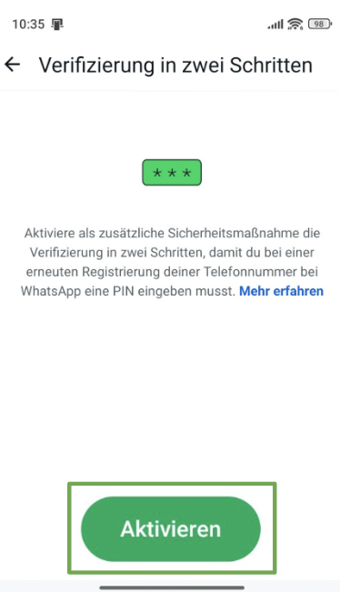 Wenn die zweistufige Verifizierung aktiviert ist, musst du außerdem eine 6-stellige PIN eingeben, die du zusätzlich zum SMS-Code erstellst. Das ist ein zusätzlicher Schutz, denn selbst wenn jemand deinen Registrierungscode stiehlt, kann er dein Konto ohne deine PIN nicht sofort neu registrieren.
