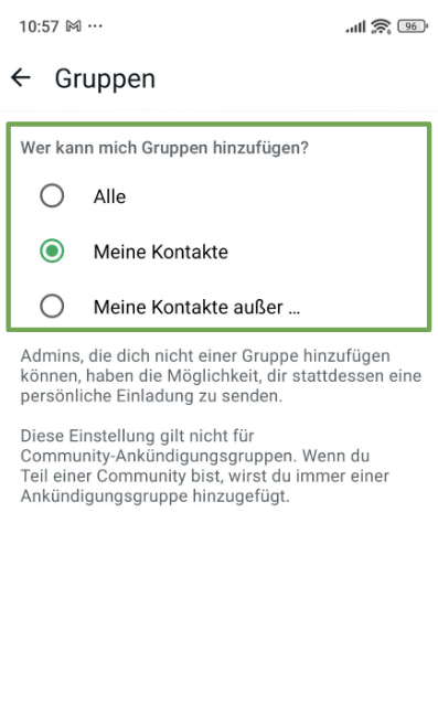 Es gibt verschiedene Datenschutzeinstellungen in WhatsApp, die du anpassen kannst, um zu bestimmen, wer deine Informationen wie dein Profilbild und deinen Status sehen kann. Du kannst auch festlegen, wer dich zu Gruppenchats hinzufügen kann, um ungewollte Kontakte zu vermeiden (standardmäßig kann dich jeder, der deine Telefonnummer hat, zu einem Gruppenchat hinzufügen).