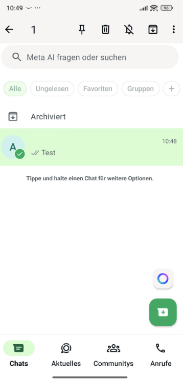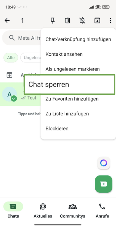 - Gehe zum Tab Chats und tippe so lange auf den Chat, den du sperren möchtest, bis ein grünes Häkchen erscheint.
