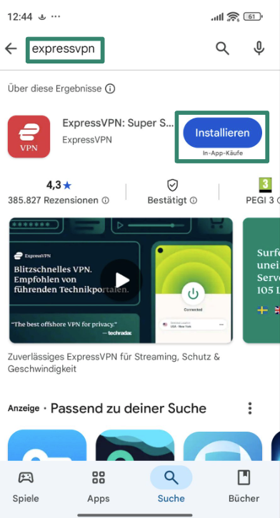 - Suche nach ExpressVPN und tippe auf „Laden", um die App auf Deinem Gerät zu installieren.
