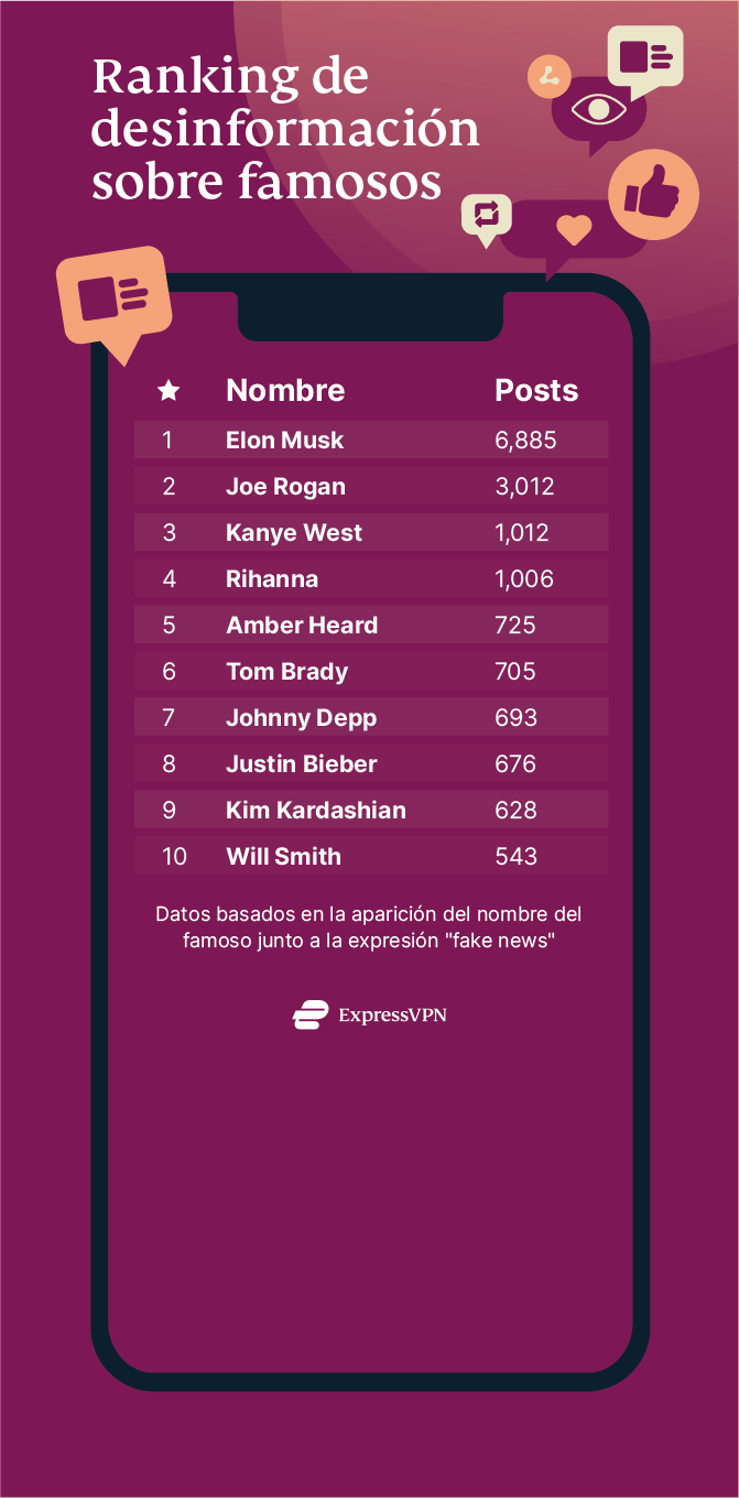 Primero identificamos los nombres de los famosos más buscados online, y después utilizamos datos de escucha de redes sociales para determinar con cuánta frecuencia se mencionaban sus nombres (en redes sociales, foros y comentarios) junto a la frase "noticias falsas", desde enero hasta octubre de 2022. A continuación, clasificamos a los famosos de acuerdo con diversos factores, como la cantidad de publicaciones, impresiones, alcance e interacciones.
