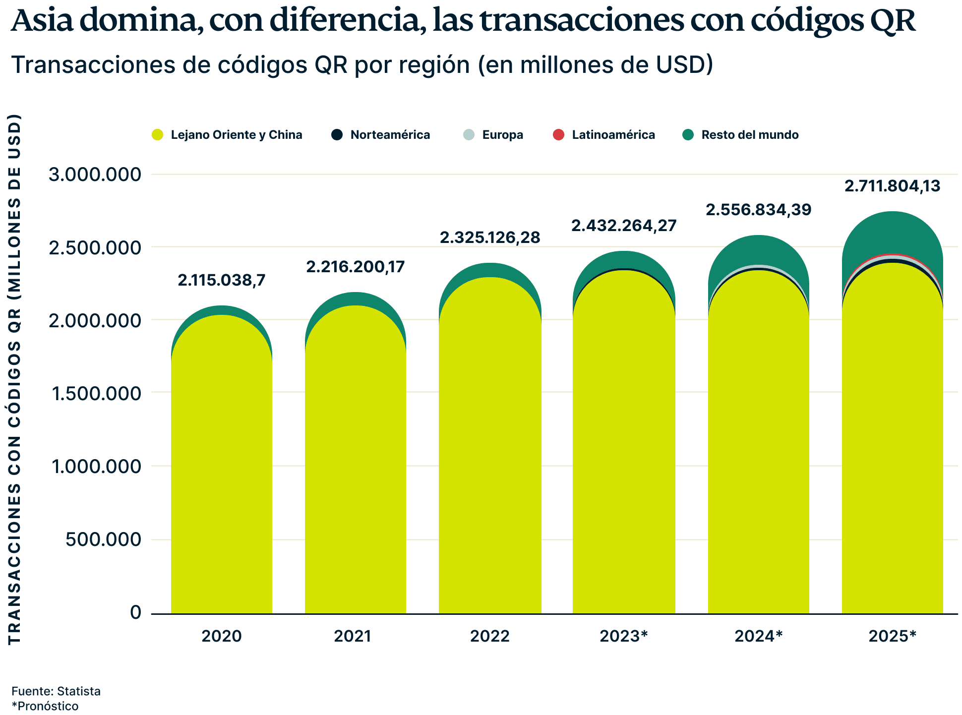 Según Statista, se espera que la región complete transacciones por concepto de 2,2 billones de USD por códigos QR tan solo en 2023. Esto viene seguido de América del Norte, cuyos consumidores harán transacciones con códigos QR por valor de 15.400 millones de USD, y después Latinoamérica, cuyo volumen esperado es de 3.400 millones de dólares.