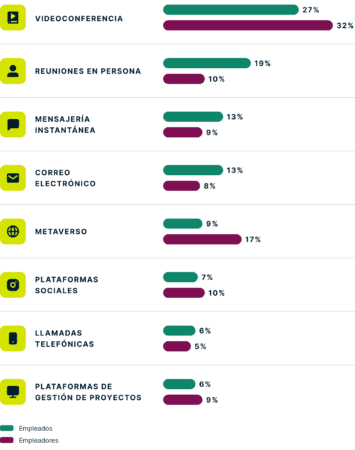 Los entornos laborales híbridos y remotos implican un alto nivel de dependencia tecnológica para que los trabajadores puedan mantenerse productivos y conectados a sus entornos laborales. Tanto los trabajadores como los empleadores están de acuerdo en que los avances tecnológicos han mejorado la productividad y han fomentado las conexiones con sus compañeros de trabajo. Tanto unos como otros afirman también que la tecnología que más fomenta la conexión entre compañeros es la de videoconferencias.
