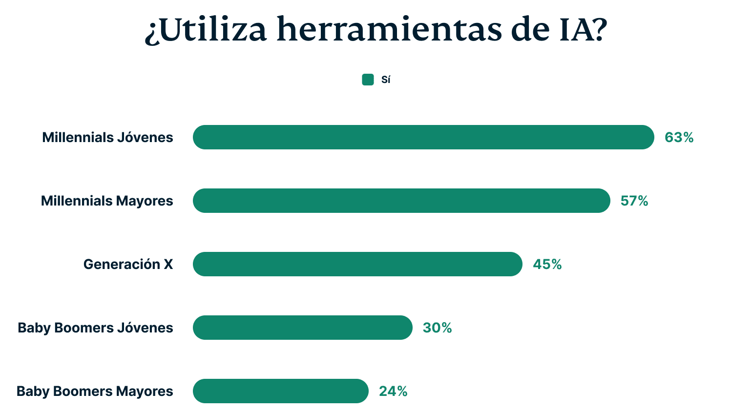 Cuando se trata de utilizar herramientas de IA, hay una división notable entre generaciones. Nuestra encuesta muestra que el 63% de los millennials jóvenes están interactuando con la IA de alguna forma, ya sea con chatbots, asistentes inteligentes o aplicaciones más avanzadas. Sin embargo, a medida que subimos en la escala de edades, el entusiasmo disminuye. Solo el 45% de la Generación X dice que usa la IA ocasionalmente o todo el tiempo, y este número cae drásticamente al 24% entre los mayores de 69 años.