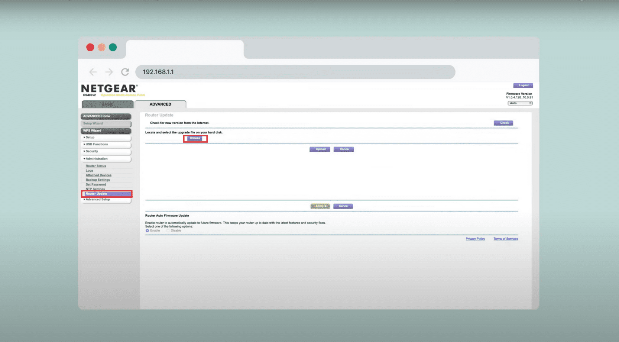 Par exemple, sur un routeur Netgear, vous devez sélectionner l’onglet Avancé, puis naviguer vers Administration et sélectionner Mise à jour du routeur.