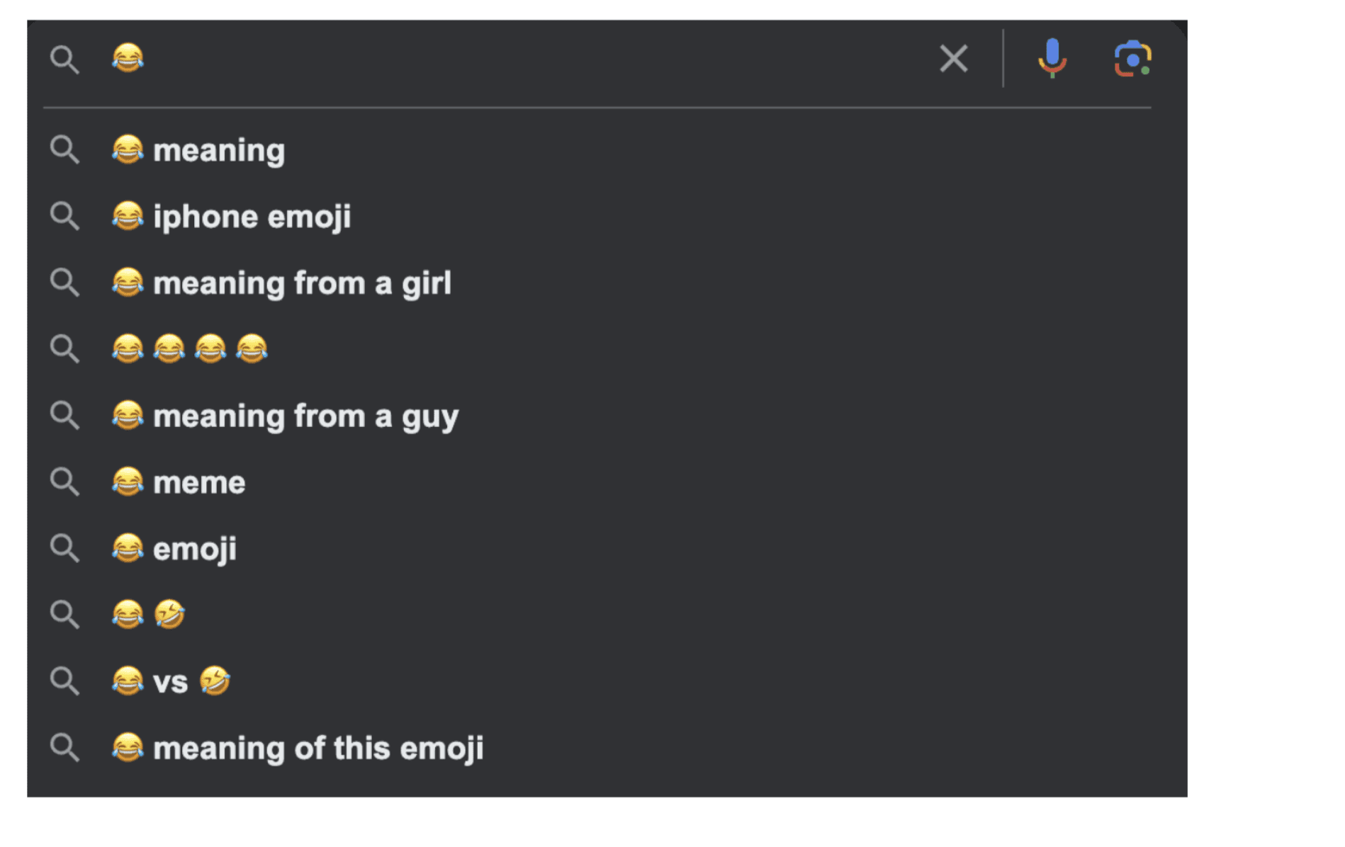 Les émojis suscitent également diverses interprétations en fonction du destinataire, d'où la tendance à penser qu'ils sont porteurs de messages cachés. Exemple : consultez la recherche prédictive correspondant à l'émoji 😂 :