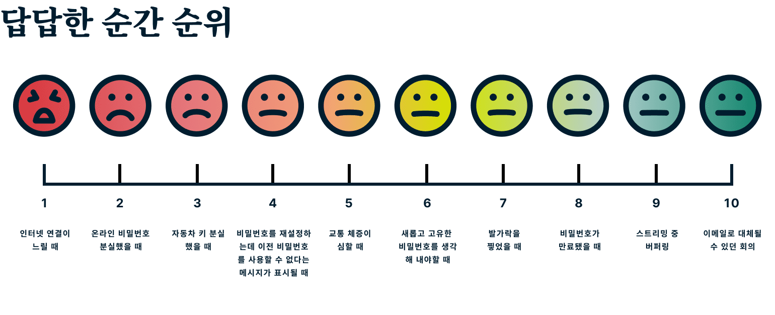 응답자의 대부분(35%)은 온라인 비밀번호를 잊어버릴 때보다 더 짜증난다고 여기는 유일한 경우로 인터넷 연결 속도가 느릴 때를 꼽았습니다. 그 다음으로는 비밀번호를 재설정 시 이전과 같은 비밀번호를 사용할 수 없다는 문구를 볼 때(25%)를 꼽았습니다.