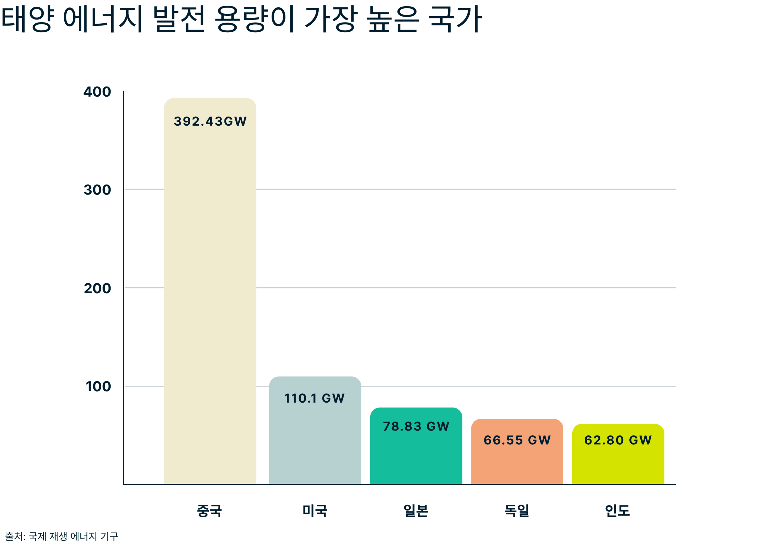 2023년 전 세계적으로 재생 에너지 시스템이 50% 더 추가되었는데 그러한 증가의 ¾은 태양열 에너지가 차지했습니다. 태양열 에너지 생산에서 절대적인 선두 주자는 중국으로, 중국은 2023년에 전 세계가 그 전년도에 설치한 태양광 발전소보다 더 많은 태양광 발전소를 설치하여 1년 만에 태양열 에너지 생산을 66% 늘렸습니다.