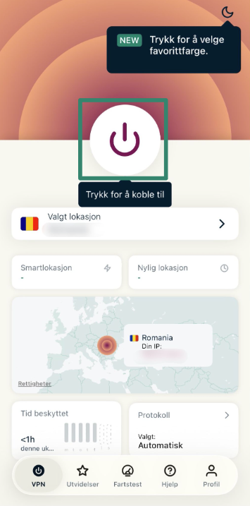 - Klikk på «Hurtigtilkobling» for å koble til og skjule IP-adressen din.