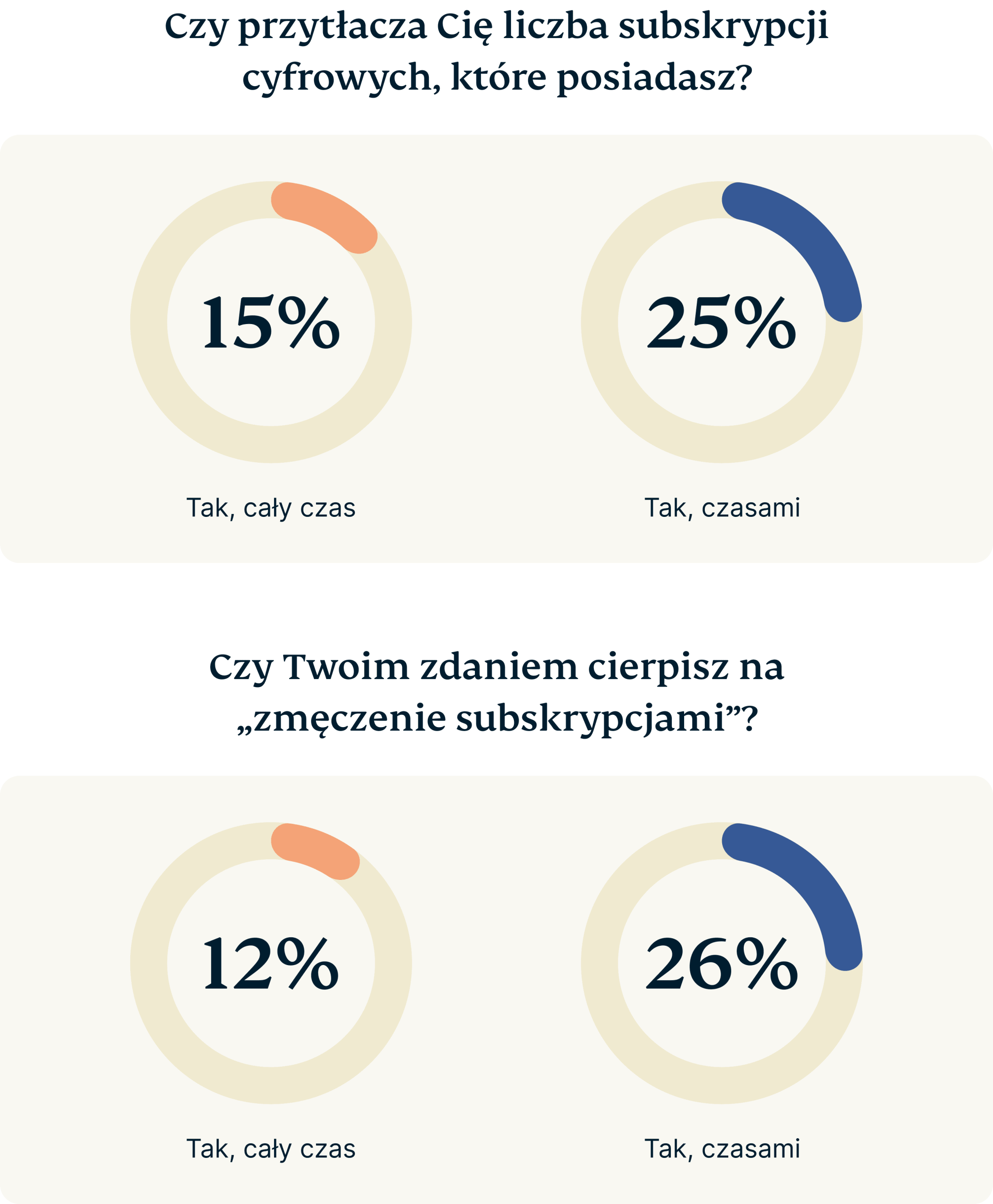 Jednak nie tylko koszty czy urządzenia, z których korzystamy, przyczyniają się do zmęczenia subskrypcjami. To także obciążenie psychiczne, które wiąże się z zarządzaniem tak wieloma usługami. Według naszej ankiety, 40% respondentów przyznało się do odczuwania przytłoczenia liczbą subskrypcji cyfrowych, którymi zarządzają.