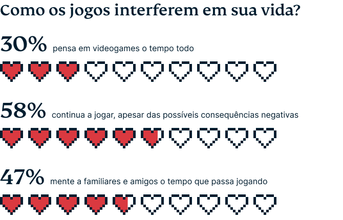 Ser incapaz de encontrar prazer fora do mundo dos jogos pode levar à obsessão por videogames e à negligência de atividades diárias essenciais, como comer, participar de interações sociais, dormir e trabalhar. De forma preocupante, mais da metade dos entrevistados confessou que continua a jogar videogames com frequência, embora saiba que isso pode afetar negativamente suas vidas diárias.