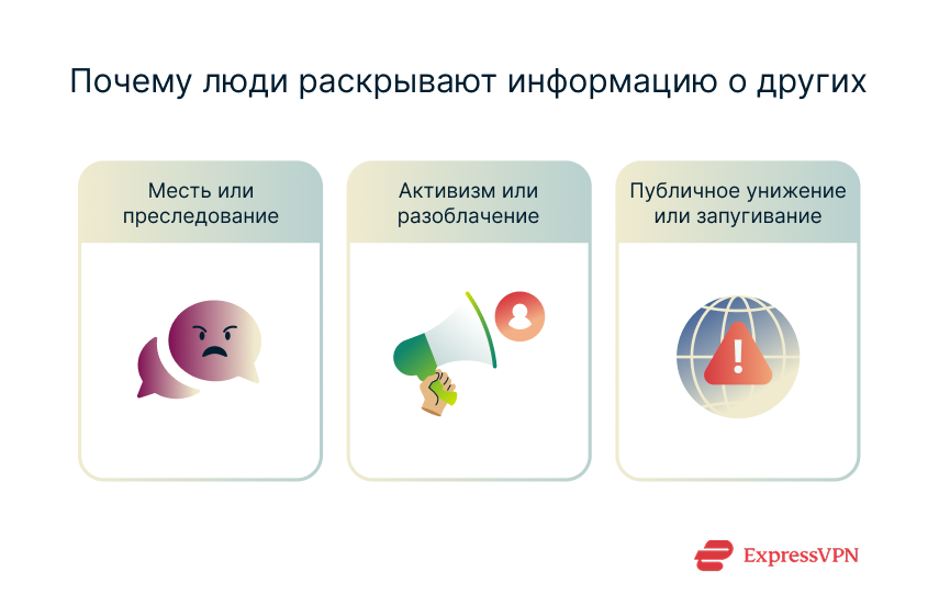 Доксинг часто используется, чтобы отомстить — например бывшему другу, эксу или участнику конфликта в сети. Открытая публикация чьих-то личных данных может заставить человека почувствовать себя разоблаченным, уязвимым и незащищенным.