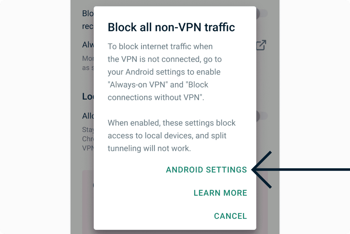 ExpressVPN also supports full leak-proofing (blocks all internet activity) via the Android system settings for Android 8.0 or above. If enabled, this setting: