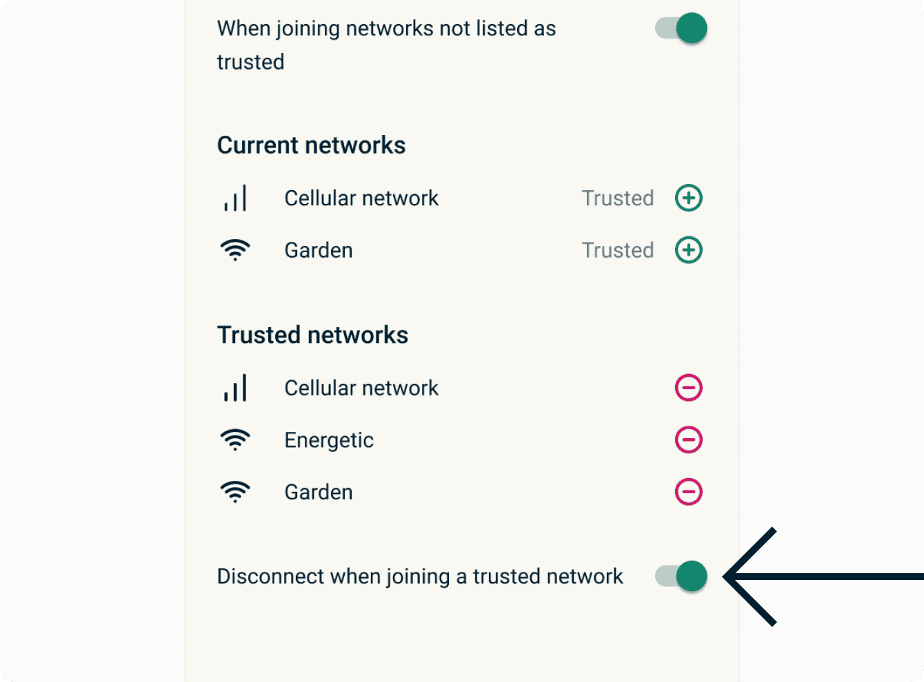 If you want to keep the VPN off when joining a network you trust (e.g., your home network), you can mark the network as “trusted” in the app settings and disable the VPN for “trusted” networks.